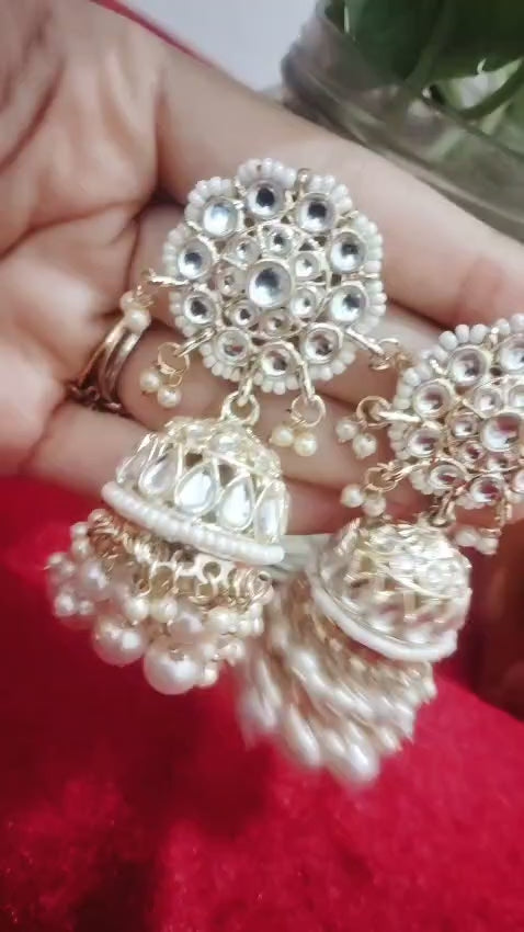 • Classic Look: A shining white traditional jhumki that offers a look of pure sophistication and grace, perfect for complementing your ethnic attire.