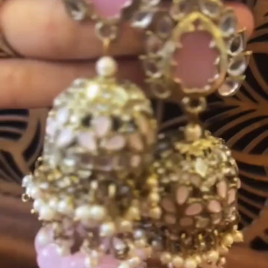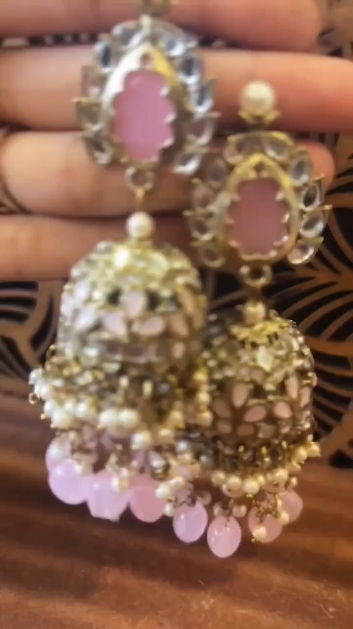 Make a statement with these stunning jhumkis — featuring rose-toned beads, glimmering kundan, and pearl clusters. The perfect blend of tradition and trend for every celebration.